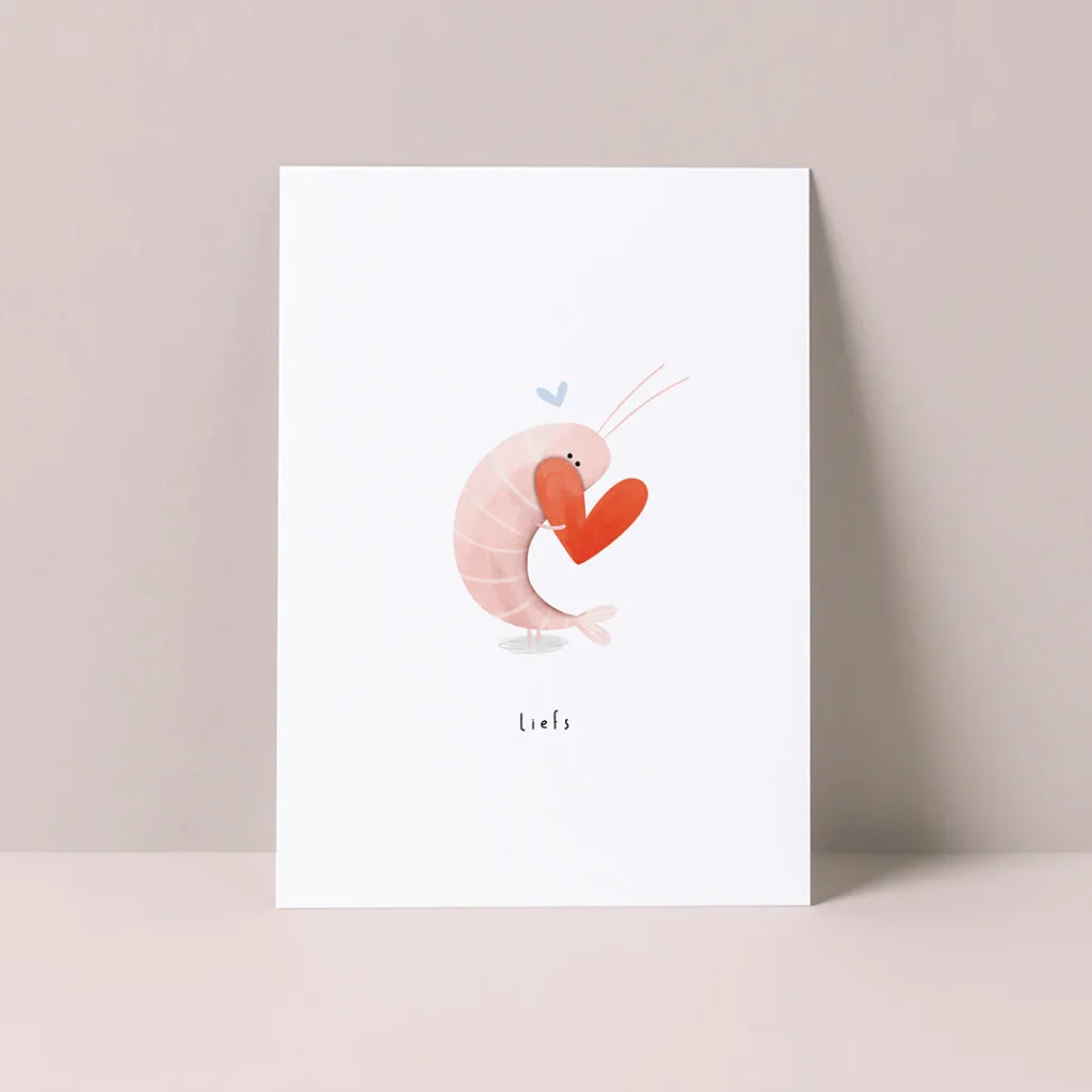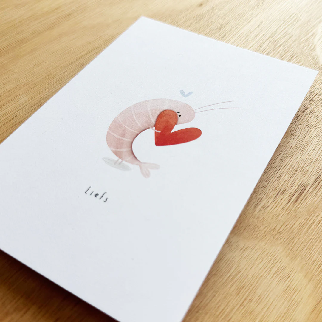 Nog zo’n lief kaartje van Alijt! Op deze kaart houdt een schattige garnaal een rood hartje stevig vast. Een vrolijke manier om iemand te laten weten dat je aan hem of haar denkt. Onder de illustratie staat de tekst ‘liefs’.