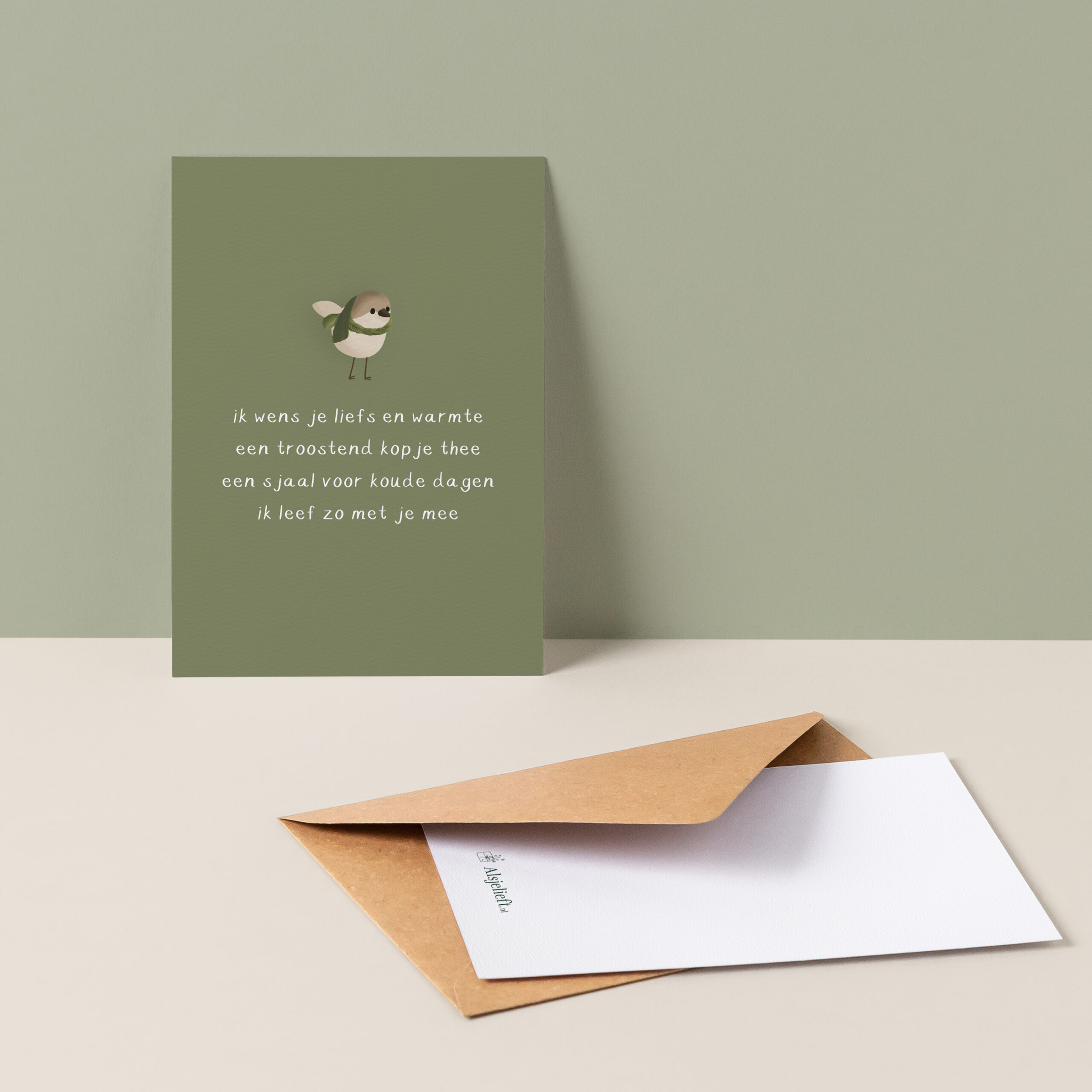 De kaart is gedrukt op luxe 350-grams structuurpapier, waardoor hij stevig aanvoelt en extra bijzonder oogt. De achterkant heeft veel schrijfruimte, zonder adreslijntjes, zodat je alle ruimte hebt voor een persoonlijke boodschap of uitgebreide woorden van steun. Bij deze kaart ontvang je een mooie 100% gerecyclede kraft envelop — duurzaam, stijlvol en klaar om te versturen. Het formaat is 10,5 x 14,8 cm, het standaard ansichtkaartformaat dat precies goed in de hand ligt en makkelijk te verzenden is.