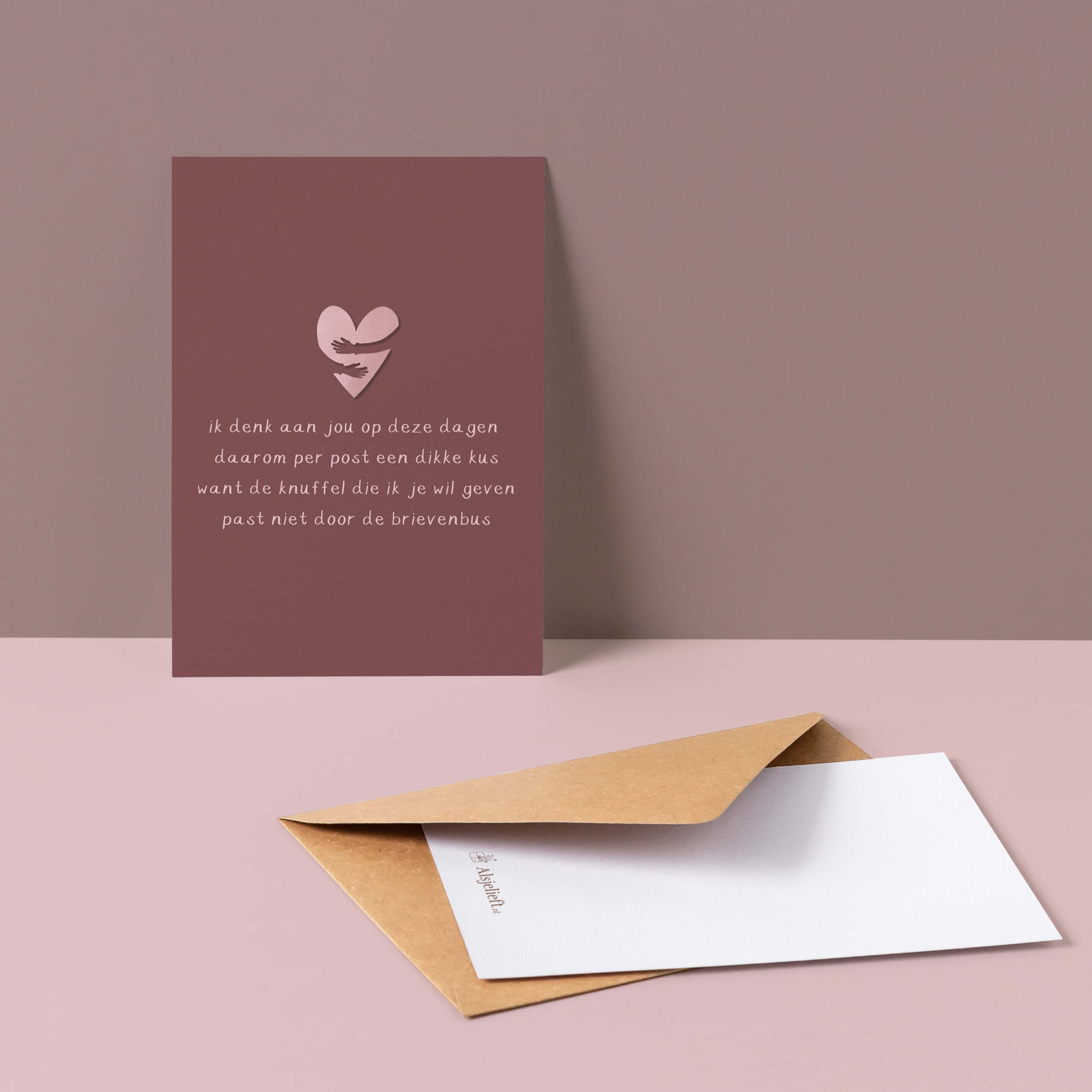 Combineer met een cadeautje, direct te versturen naar de ontvanger Combineer je deze kaart met een cadeautje uit onze webshop? We sturen het pakketje ook graag direct voor je op naar de ontvanger! Vul bij factuuradres je eigen adres in en bij het verzendadres het adres van de ontvanger. Bij het afrekenen kun je bij ‘opmerkingen’ een persoonlijk berichtje achterlaten, wij schrijven jouw berichtje dan voor je op de kaart.Losse kaart + envelop De kaart is gedrukt op luxe 350-grams structuurpapier, waardoor hij stevig aanvoelt en extra bijzonder oogt. De achterkant heeft veel schrijfruimte, zonder adreslijntjes, zodat je alle ruimte hebt voor een persoonlijke boodschap of uitgebreide woorden van steun. Bij deze kaart ontvang je een mooie 100% gerecyclede kraft envelop — duurzaam, stijlvol en klaar om te versturen. Het formaat is 10,5 x 14,8 cm, het standaard ansichtkaartformaat dat precies goed in de hand ligt en makkelijk te verzenden is.Gratis verzending vanaf €40.-