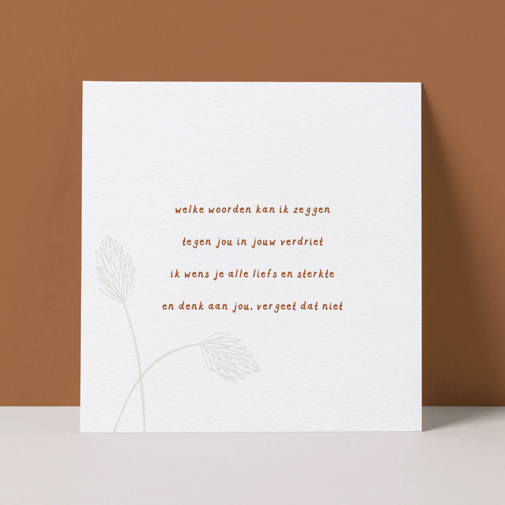 Soms weet je niet weet wat je moet zeggen. Laat weten dat je aan iemand denkt, met deze kaart met gedichtje ‘Alle liefs en sterkte’.Deze kaart is gedrukt op luxe 350-grams structuurpapier. Op de achterkant is veel schrijfruimte. Je krijgt er een envelop (13×13) van 100% gerecycled kraftpapier bij.De kaart is los te koop, en ook als onderdeel van een Set van 9 kaarten + envelop.