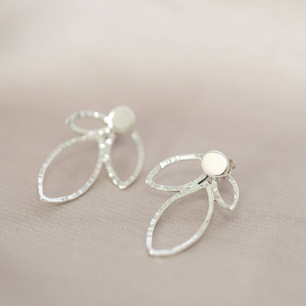 Prachtige, handgemaakte oorbellen met een verfijnde uitstraling. Deze modulaire set bestaat uit twee zilveren oorknopjes met zilveren hangers in de vorm van drie blaadjes.