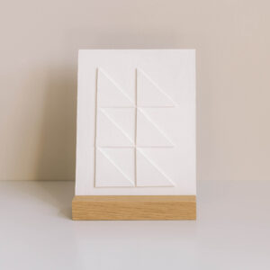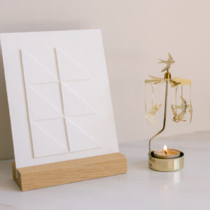 Het kunstwerkje kun je neerzetten in de bijgeleverde houder van massief eikenhout.