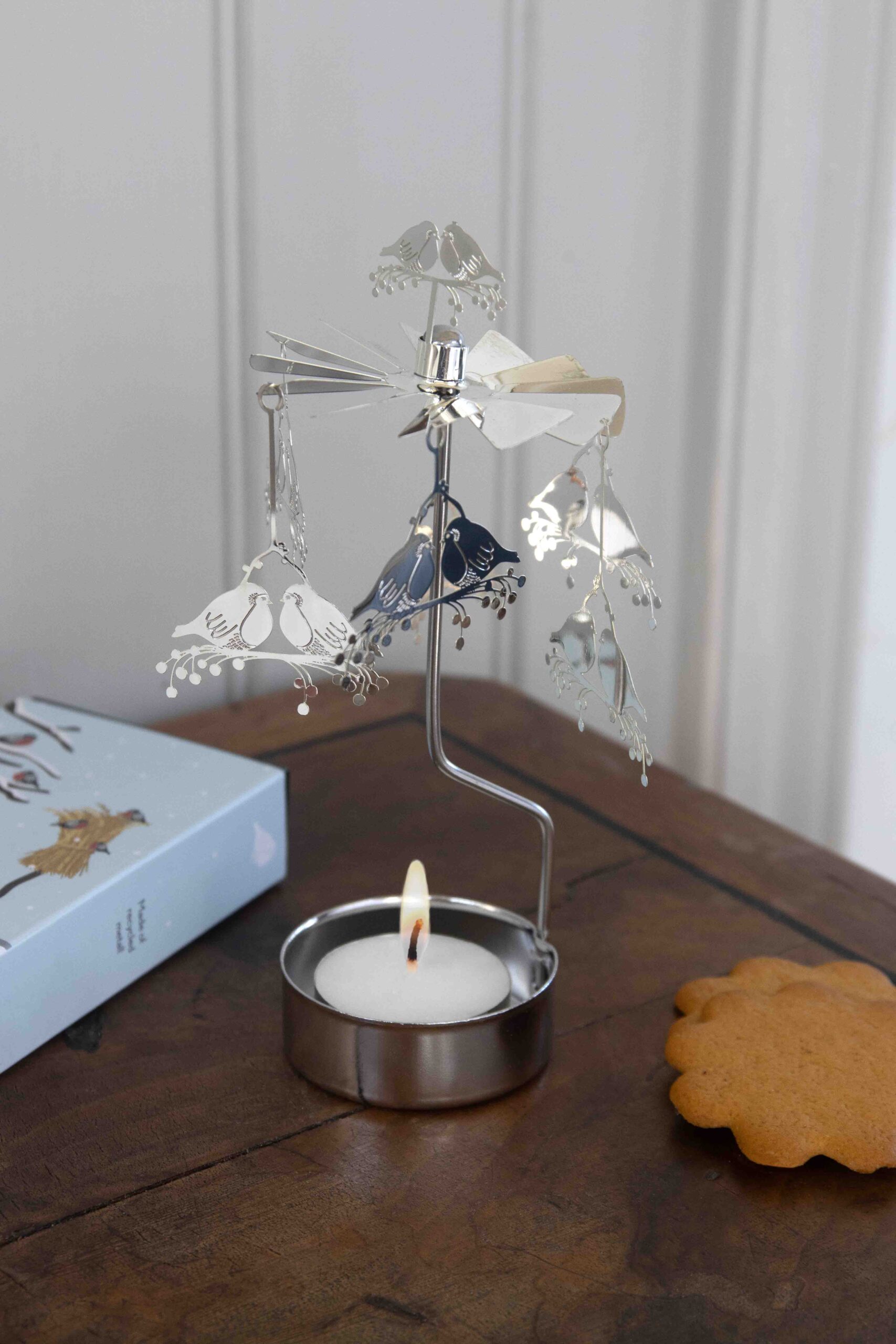 Deze zilverkleurige waxinelichthouder van Pluto Produkter is een gezellige toevoeging aan je interieur en ook heel leuk om als cadeau te geven. Zodra je het bijgeleverde waxinelichtje aansteekt, komen de roodborstjes sierlijk in beweging door de opstijgende warme lucht. Het zachte, ronddraaiende licht zorgt voor een betoverend effect — perfect voor donkere winteravonden.
